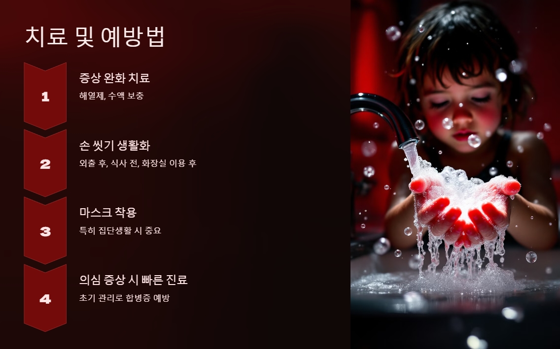 감염된 사람과의 밀접한 접촉을 막기 위해 마스크 착용이 권장됩니다. 특히, 어린이집이나 유치원 등에서 집단생활을 하는 경우 마스크 착용은 더욱 중요합니다.