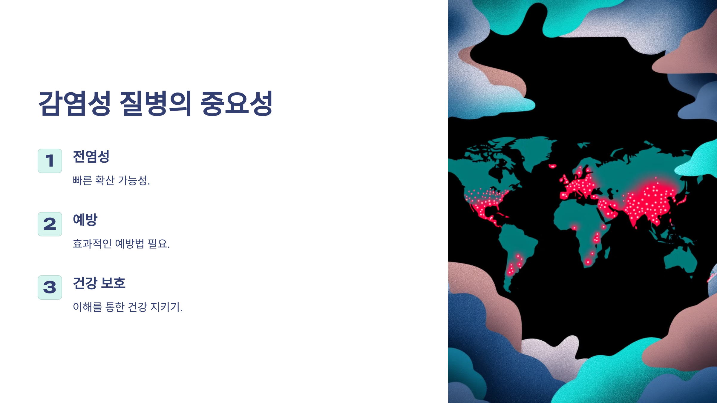 감염성 질병은 개인의 건강을 넘어 사회 전체에 큰 영향을 미칩니다. 개인이 위생을 철저히 하고, 백신 접종 및 면역력을 유지하는 생활 습관을 가지는 것은 감염성 질병의 확산을 막는 데 큰 도움이 됩니다. 또한, 감염병에 대한 지식과 예방 방법을 주변 사람들과 공유함으로써, 우리 모두가 함께 건강한 사회를 만들 수 있습니다. 감염 예방의 기본 원칙을 일상에서 실천해 보세요!