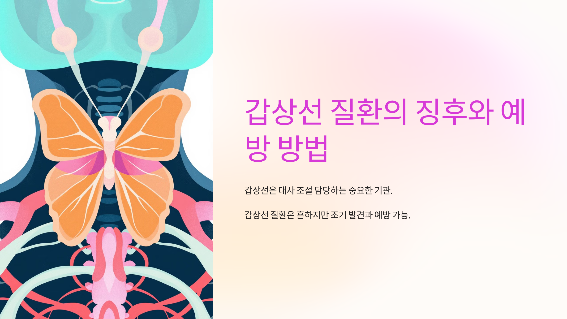 갑상선은 목 앞쪽에 위치한 나비 모양의 작은 기관으로, 우리 몸의 대사 조절을 담당합니다. 갑상선 호르몬이 적절히 분비되지 않으면 다양한 증상이 나타나는데, 이를 갑상선 질환이라고 합니다. 현대인들에게 갑상선 질환은 비교적 흔하지만 조기 발견과 예방이 가능합니다. 이번 글에서는 갑상선 질환의 주요 증상과 예방 방법을 알아보며 건강을 지키는 방법에 대해 설명하겠습니다.
