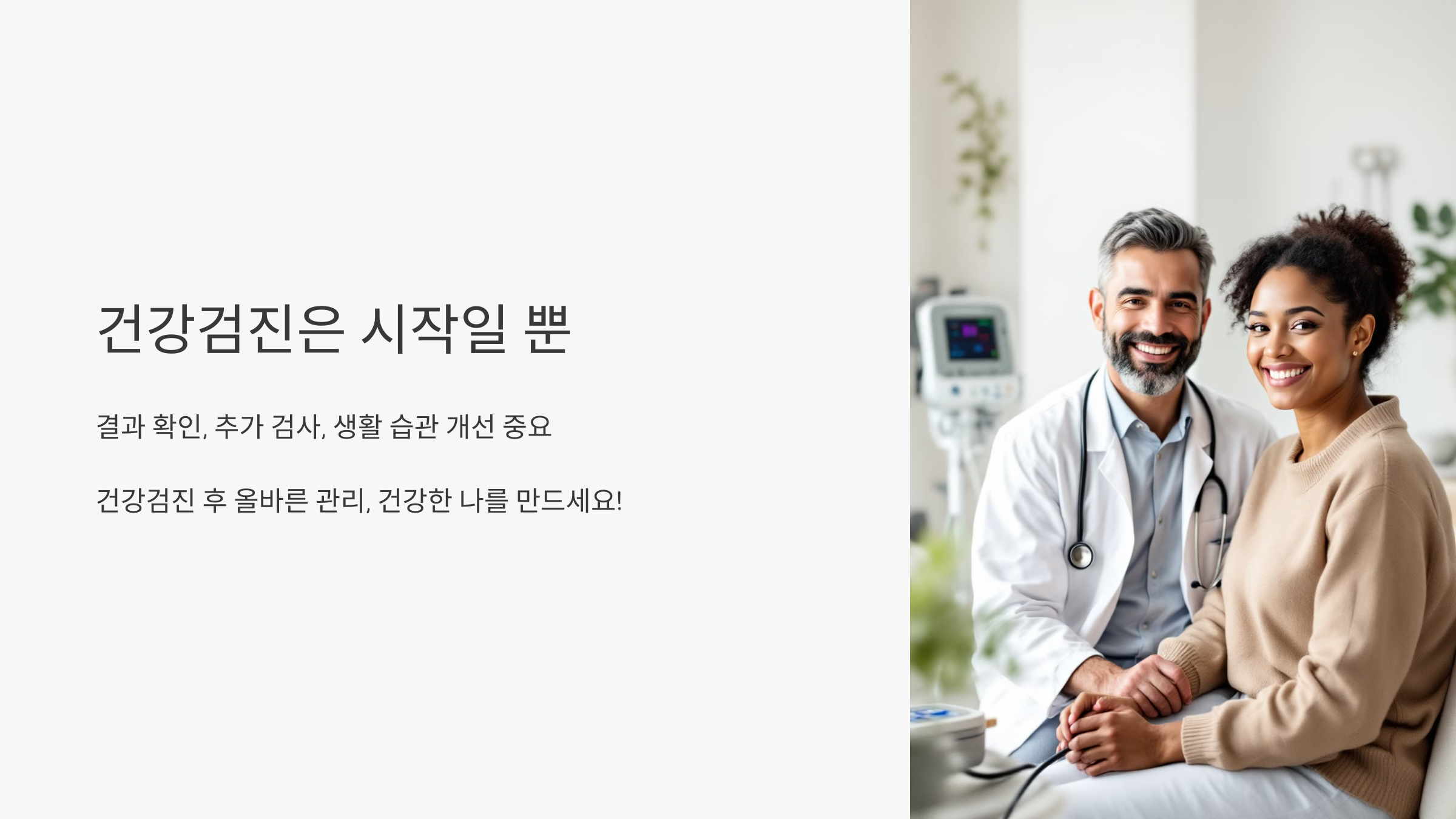 건강검진은 시작일 뿐, 그 후 관리가 더욱 중요합니다. 결과지를 꼼꼼히 확인하고, 필요 시 추가 검사를 받으며, 생활습관을 개선하는 과정이 건강을 지키는 핵심입니다. 건강검진 후 올바른 관리를 통해 더욱 건강한 나를 만들어보세요! 😊