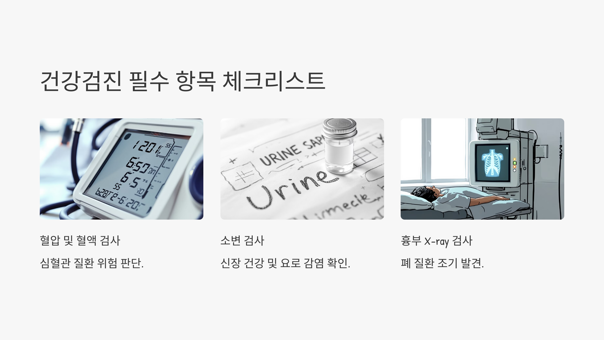 건강검진에서 어떤 항목을 선택해야 할지 고민되시나요? 검사 항목은 연령, 성별, 가족력, 현재 건강 상태에 따라 달라질 수 있습니다. 하지만 모든 사람에게 공통적으로 권장되는 기본적인 필수 항목이 있습니다. 아래에서 각 항목별로 어떤 점을 확인할 수 있는지, 왜 중요한지 자세히 설명드리겠습니다.