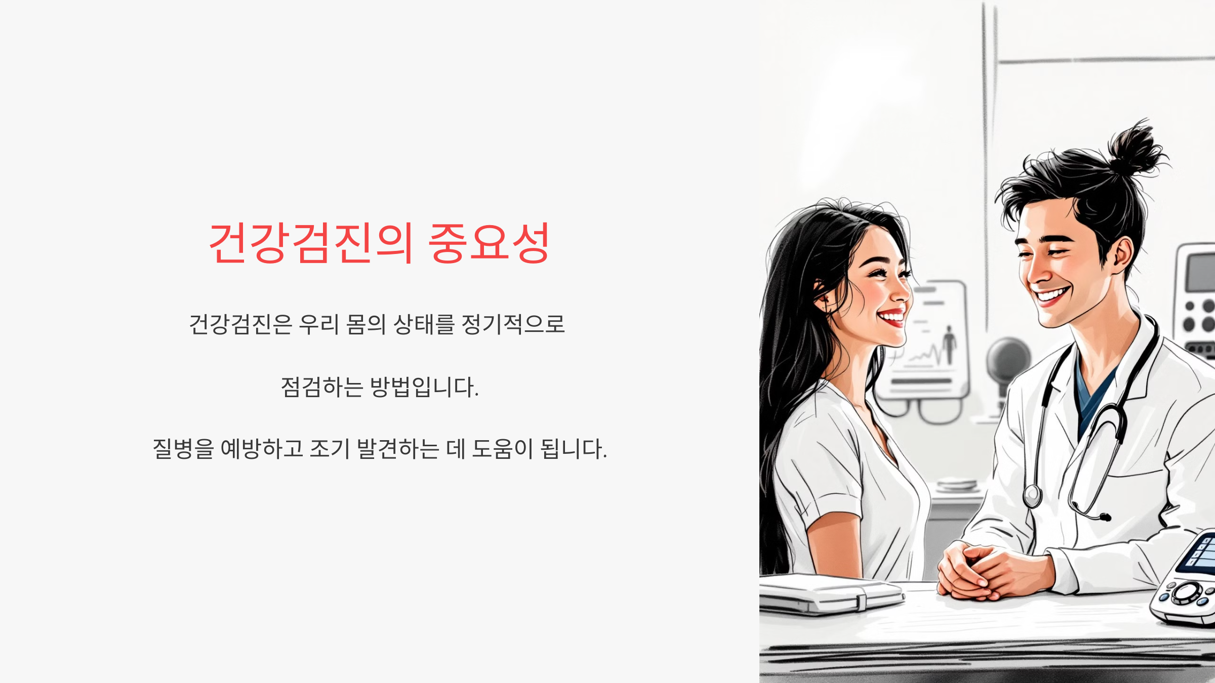 - 건강을 지키기 위한 과정: 건강검진은 잠재적인 위험을 조기에 발견하고, 내 몸을 더 잘 이해하기 위한 중요한 단계입니다.