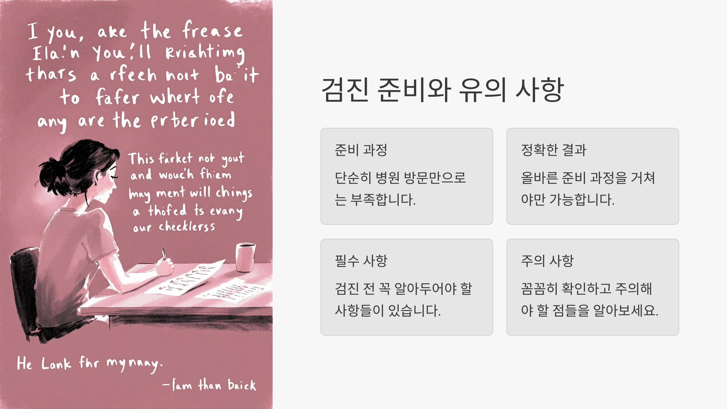 검진 전 준비 과정을 철저히 한다면 더욱 정확하고 유익한 결과를 얻을 수 있습니다. 작은 준비가 큰 결과를 만든다는 사실을 잊지 마시고, 금식부터 복장까지 꼼꼼히 체크한 후 건강검진에 임하세요! 🩺