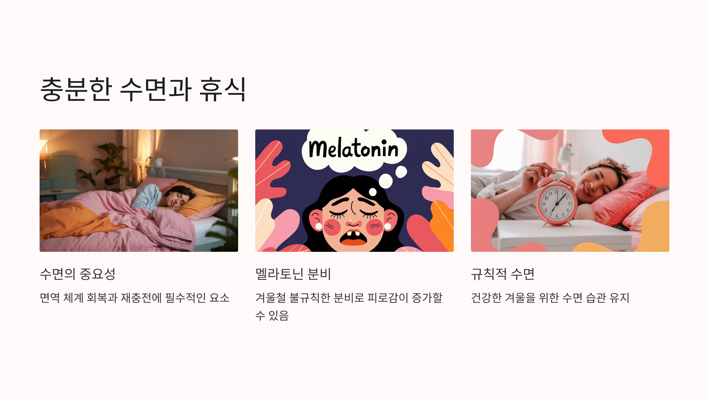수면은 면역 체계를 회복시키고, 몸과 마음을 재충전하는 데 필수적인 시간입니다. 특히 겨울철에는 낮 시간이 짧아지고 햇볕을 쬐는 시간이 줄어들면서 멜라토닌 분비가 불규칙해질 수 있습니다. 이로 인해 피로감이 증가하고 면역력이 약화될 수 있기 때문에, 규칙적인 수면 습관을 유지하는 것이 매우 중요합니다. 아래에서 겨울철 건강을 위해 왜 충분한 수면이 중요한지, 어떻게 최적의 휴식을 취할 수 있는지 자세히 알아보세요! 😊