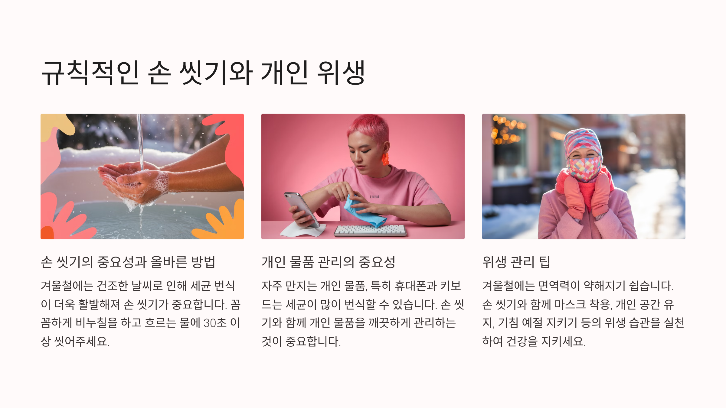 규칙적인 손 씻기와 철저한 개인 위생 관리는 겨울철 바이러스와 세균으로부터 자신과 가족을 보호하는 가장 기본적이면서도 중요한 방법입니다. 올바른 손 씻기 습관을 들이고, 자주 사용하는 물건을 주기적으로 소독하며, 감염병 예방을 위한 작은 실천을 시작해 보세요. 이 작은 습관이 건강을 지키는 큰 변화를 가져올 것입니다. 😊