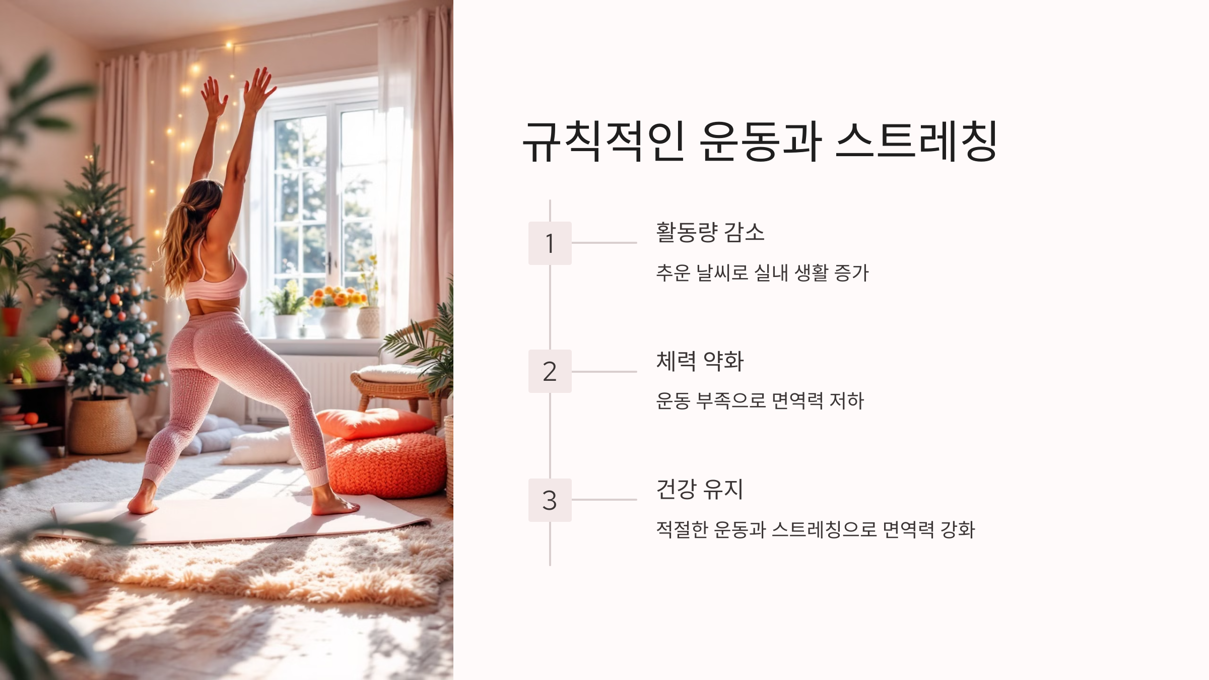 겨울철에는 추운 날씨로 인해 실내에서 보내는 시간이 늘어나고, 활동량이 자연스럽게 줄어들기 쉽습니다. 이러한 상황이 반복되면 체력이 약해지고 면역력도 떨어지게 됩니다. 하지만 운동은 면역력을 높이는 데 매우 중요한 역할을 합니다. 적절한 운동과 스트레칭을 실천하면 겨울철 건강을 지키는 데 큰 도움이 될 수 있습니다. 아래에서 겨울철 운동과 스트레칭의 중요성과 실천 방법을 자세히 알아보세요! 😊