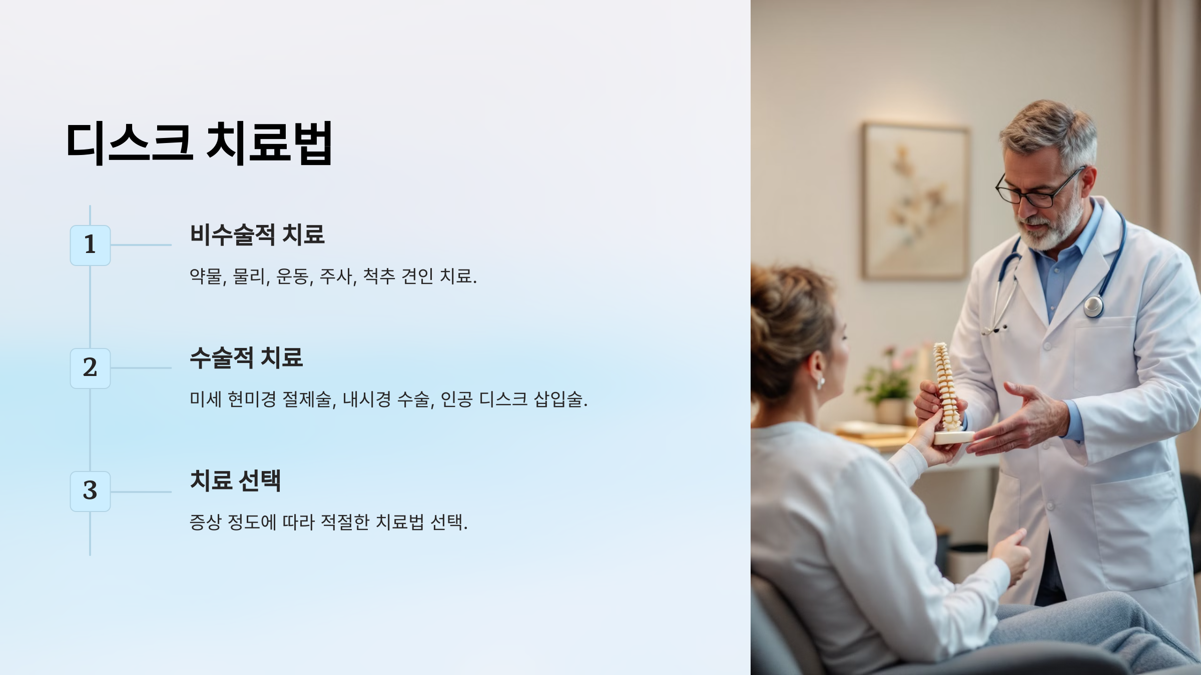 디스크 치료는 증상의 정도에 따라 비수술적 치료와 수술적 치료로 나뉩니다. 초기에는 비수술적 방법으로 증상 완화를 시도하며, 효과가 없거나 증상이 심할 경우 수술적 치료를 고려할 수 있습니다.