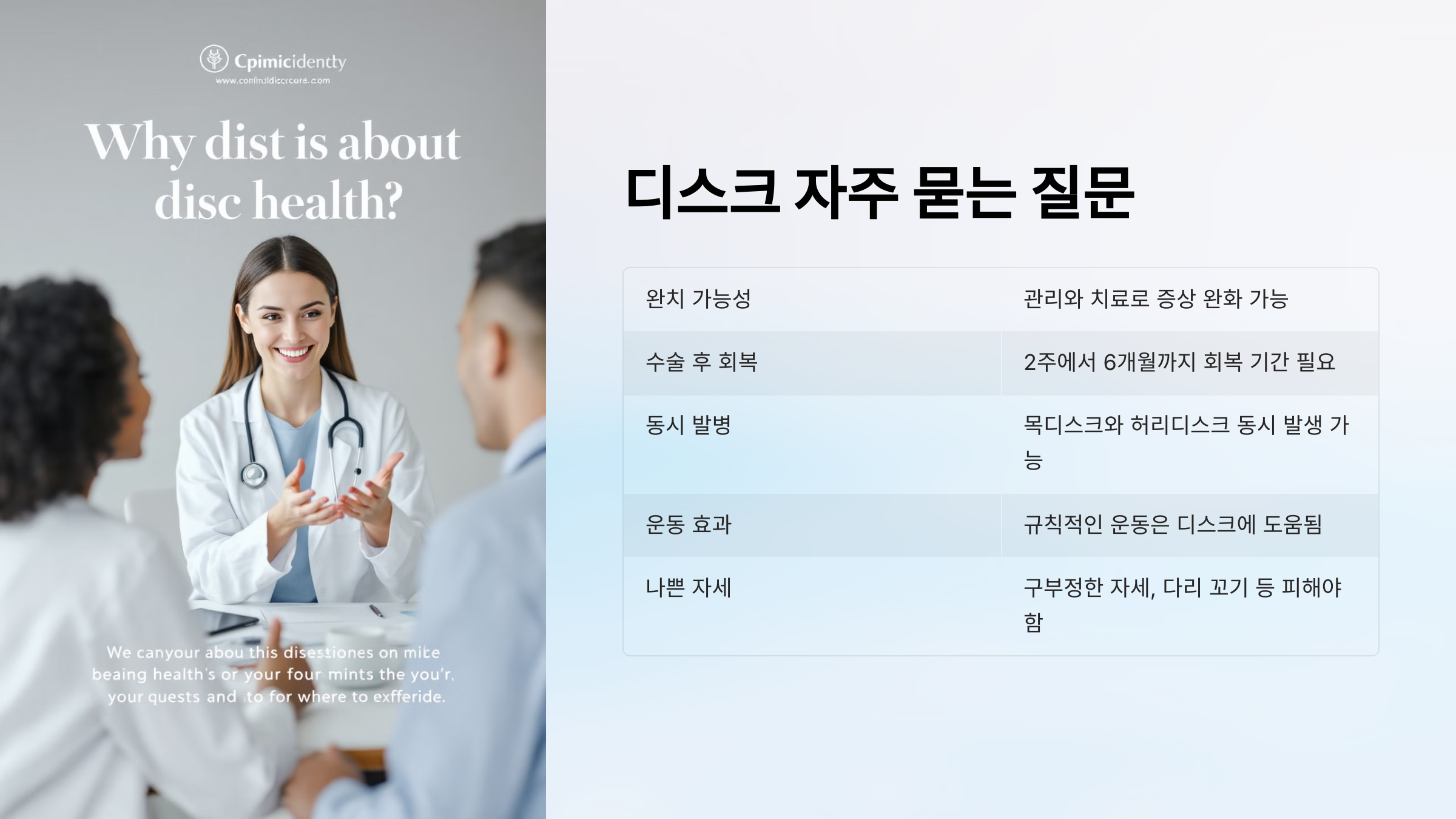 A: 디스크는 손상된 조직이므로 완치라기보다는 관리와 치료를 통해 증상을 완화할 수 있습니다. 생활 습관과 꾸준한 치료로 증상 악화를 막는 것이 중요합니다.