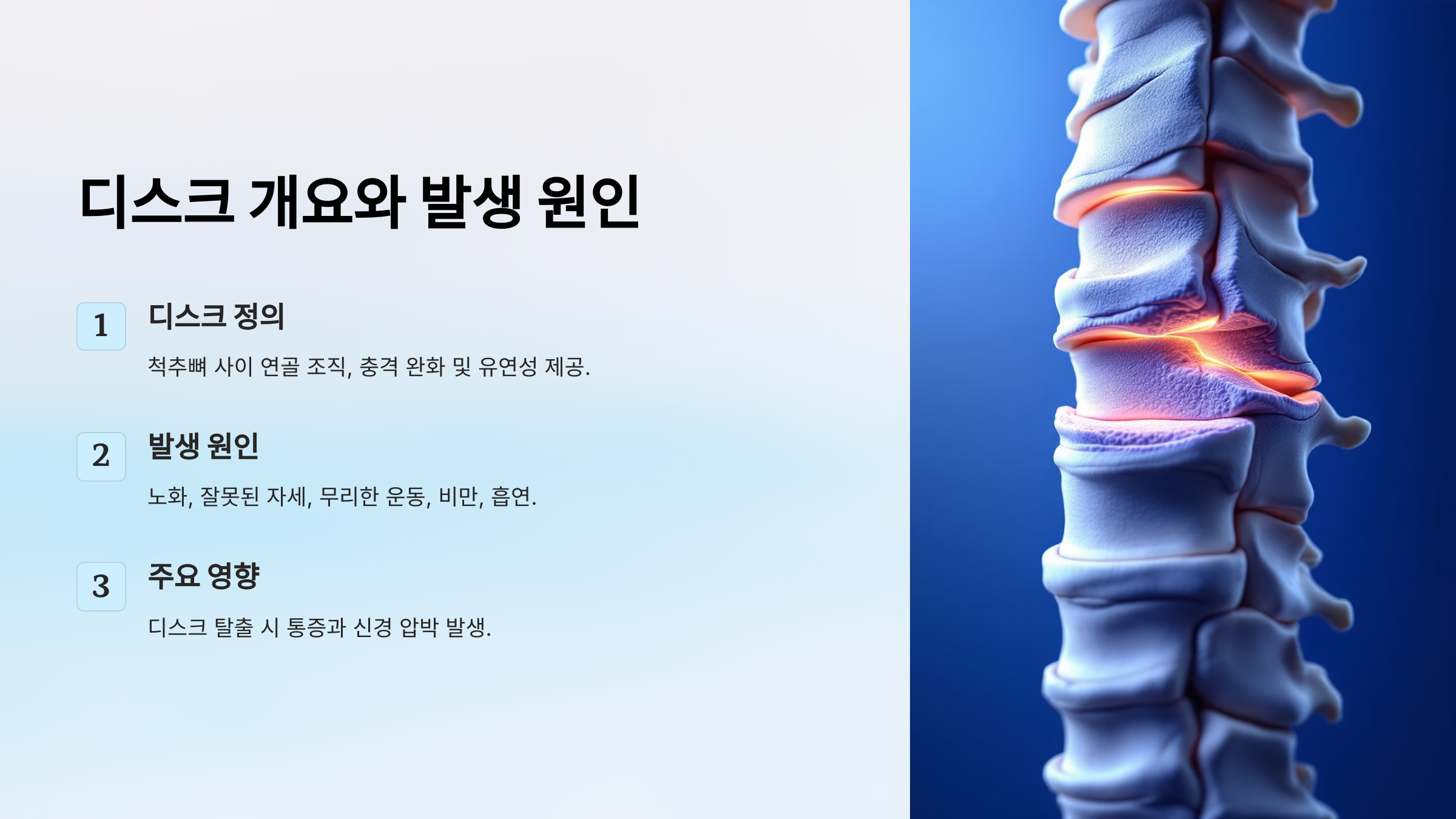 디스크는 척추뼈 사이에 위치해 충격을 완화하고 유연성을 제공하는 연골 조직입니다. 이 디스크가 탈출하거나 손상될 때 통증과 신경 압박이 발생하며, 이를 흔히 ‘디스크’라 부릅니다.
