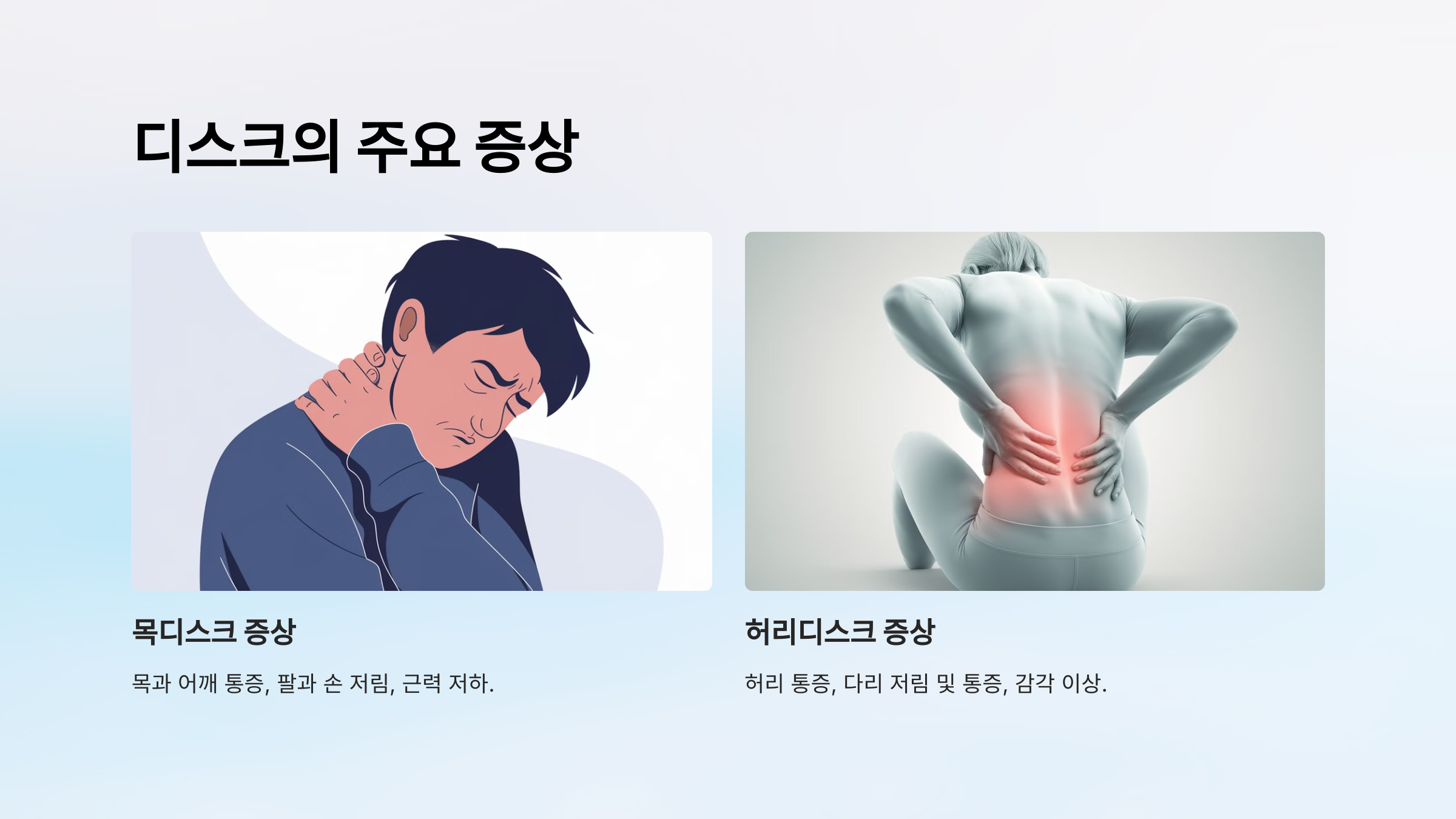 디스크의 증상은 디스크 탈출 정도와 위치에 따라 다릅니다. 목디스크와 허리디스크의 증상이 조금씩 다를 수 있으므로 주의 깊게 관찰하는 것이 중요합니다.