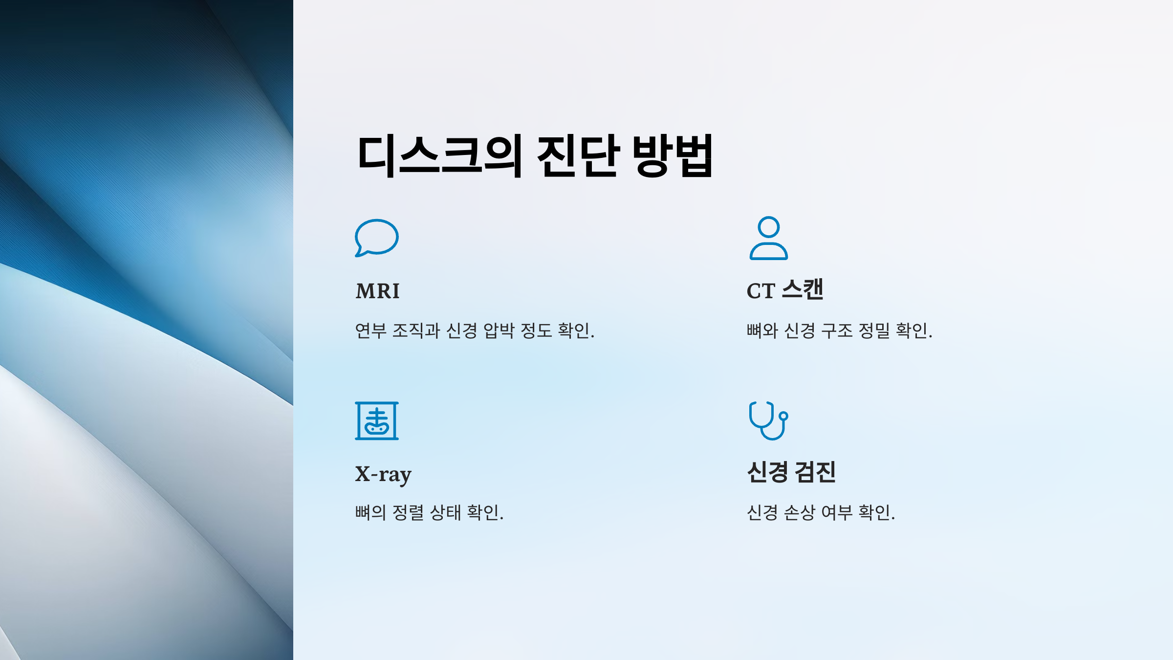 디스크를 진단하기 위해서는 정확한 검진과 영상 검사가 필요합니다. 전문의와의 상담을 통해 적절한 진단을 받는 것이 중요합니다.