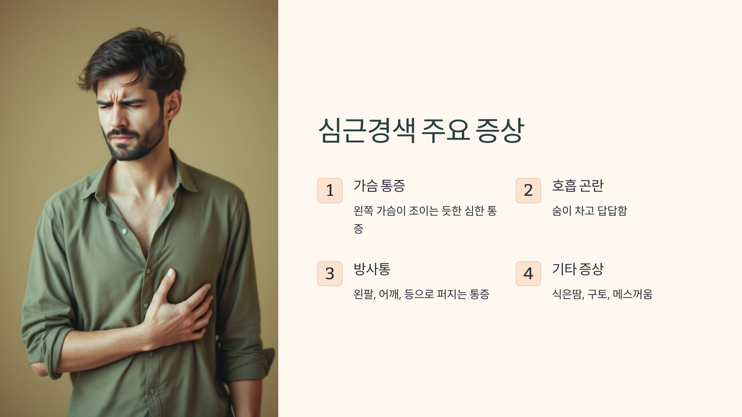 - 가슴 통증: 왼쪽 가슴이 조이는 듯한 심한 통증.