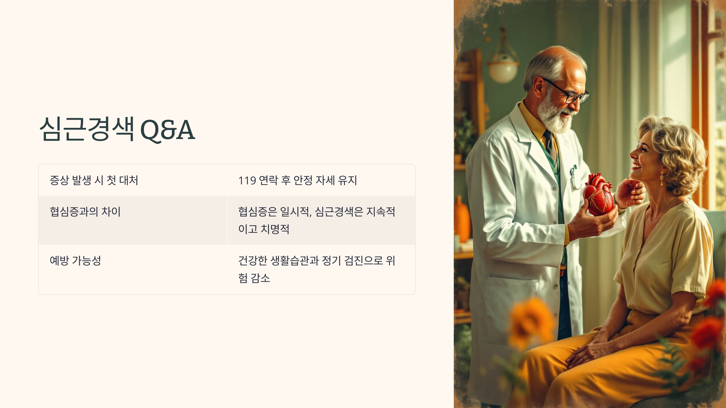 💡 TIP: 심근경색 발생 위험이 있는 가족이 있다면, 응급 처치법을 미리 숙지하세요.