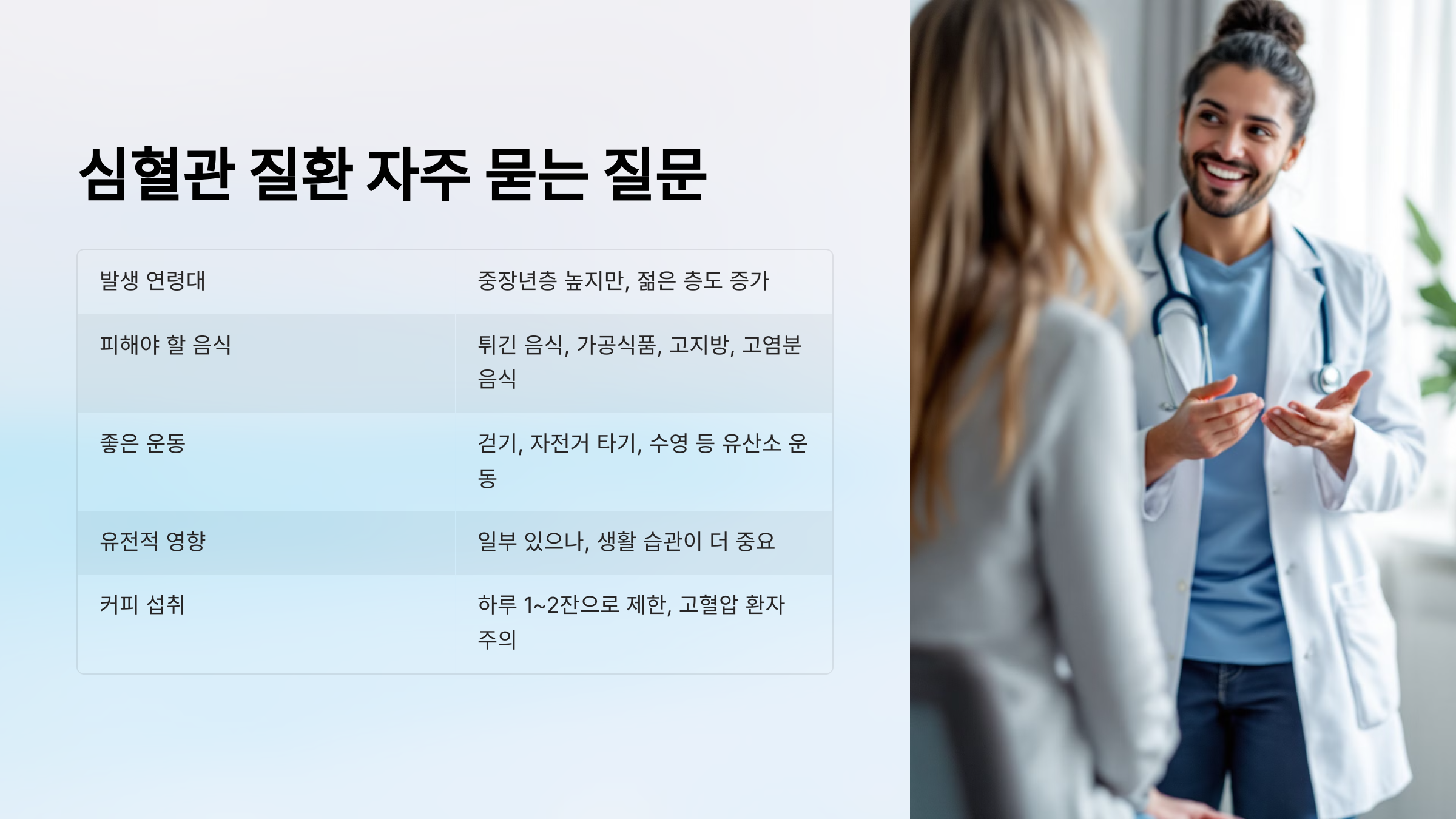 심혈관 질환은 주로 중장년층에서 발생 빈도가 높지만, 최근에는 젊은 층에서도 많이 나타나고 있습니다. 특히 스트레스와 흡연, 비만이 주요 원인으로 작용하고 있으므로 연령에 상관없이 예방이 중요합니다.
