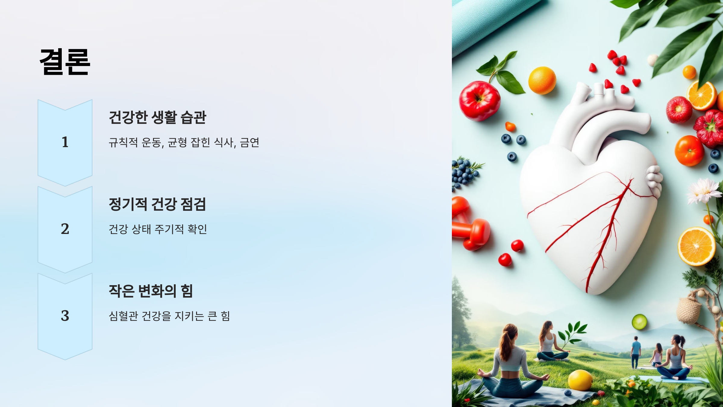 심혈관 질환은 다양한 요인에 의해 발생하지만, 건강한 생활 습관을 유지함으로써 예방이 가능합니다. 심혈관 건강을 위해 규칙적인 운동, 균형 잡힌 식사, 금연 등의 노력을 기울이고 정기적으로 건강 상태를 점검하는 것이 중요합니다. 작은 변화가 심혈관 건강을 지키는 큰 힘이 될 수 있습니다.