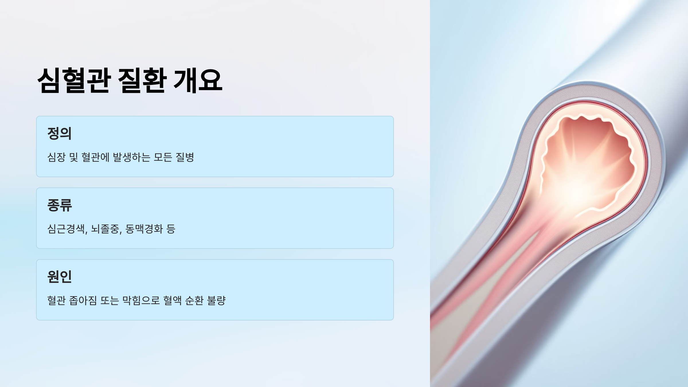 심혈관 질환은 심장 및 혈관에 발생하는 모든 질병을 포함하며, 대표적으로 심근경색, 뇌졸중, 동맥경화 등이 있습니다. 이 질환들은 혈관이 좁아지거나 막히면서 혈액 순환이 원활하지 않게 되어 발생합니다. 심혈관 질환은 조기에 발견하지 않으면 심각한 합병증을 일으킬 수 있어 적절한 예방과 관리가 중요합니다.