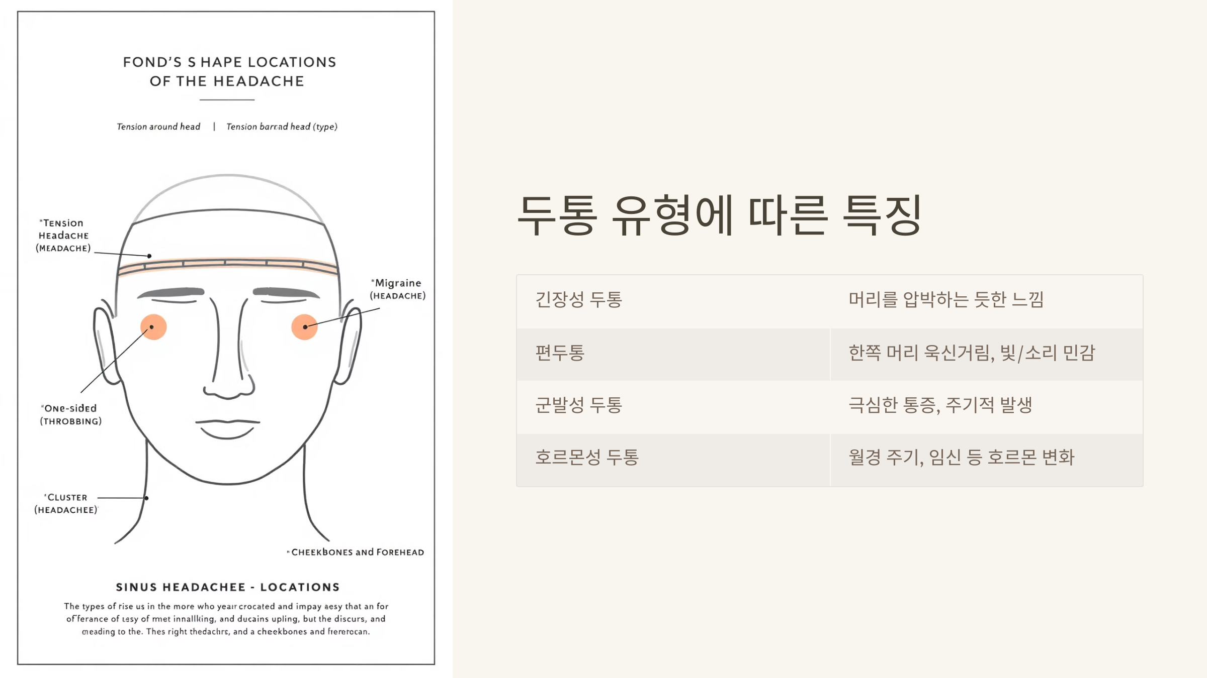 - 호르몬성 두통: 월경 주기, 임신 등 호르몬 변화로 인해 발생하는 두통입니다.