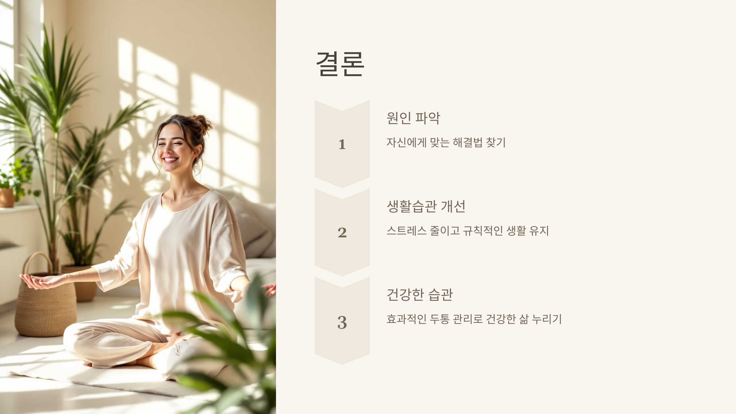 두통은 원인과 유형이 다양하기 때문에 자신에게 맞는 해결법을 찾는 것이 중요합니다. 특히 생활습관 개선이 두통 예방에 큰 영향을 미칩니다. 스트레스를 줄이고 규칙적인 생활을 유지하면서 건강한 습관을 만들어가세요. 두통을 일상에서 효과적으로 관리해 더욱 건강한 삶을 누리시기 바랍니다.