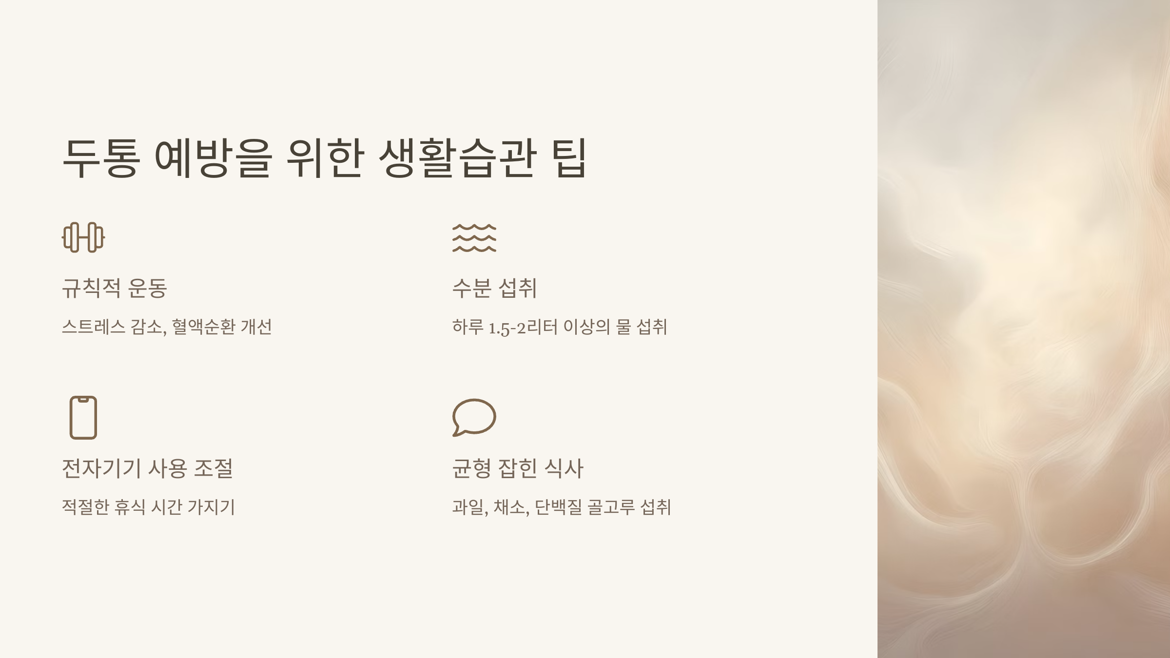 두통은 생활습관 개선을 통해 예방할 수 있는 경우가 많습니다. 일상에서 실천할 수 있는 예방법을 알아봅시다.