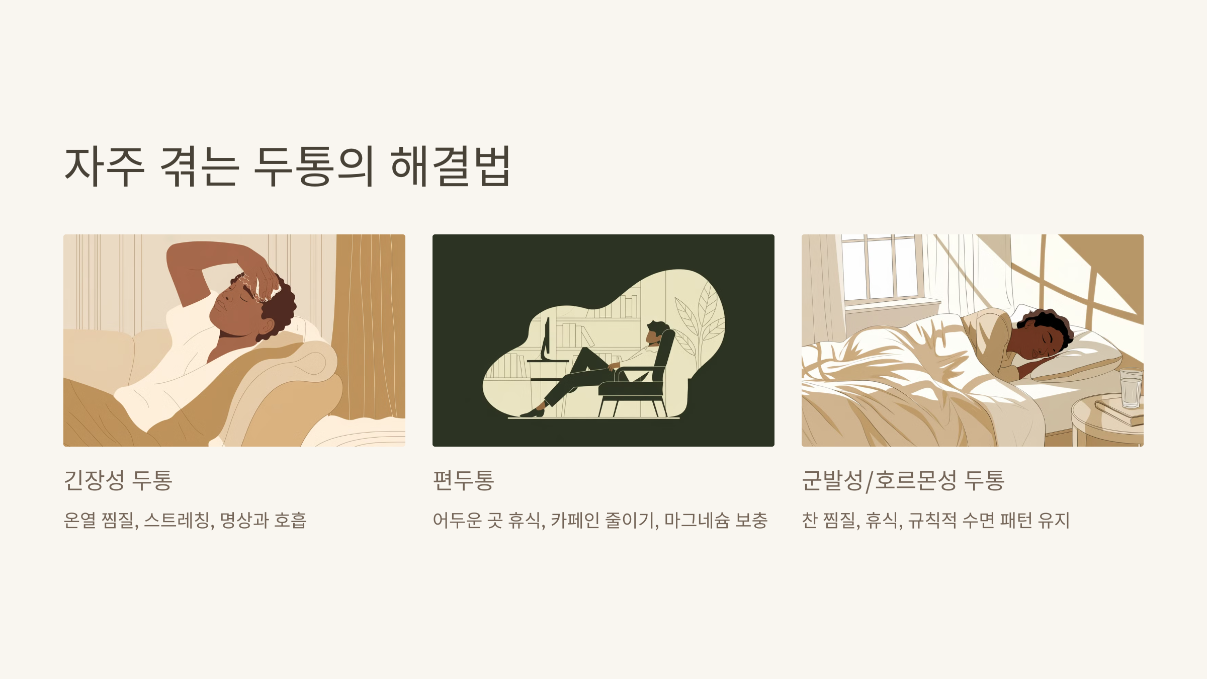 각각의 두통 유형에 맞춘 해결법을 실천하면 통증 완화에 효과적입니다.