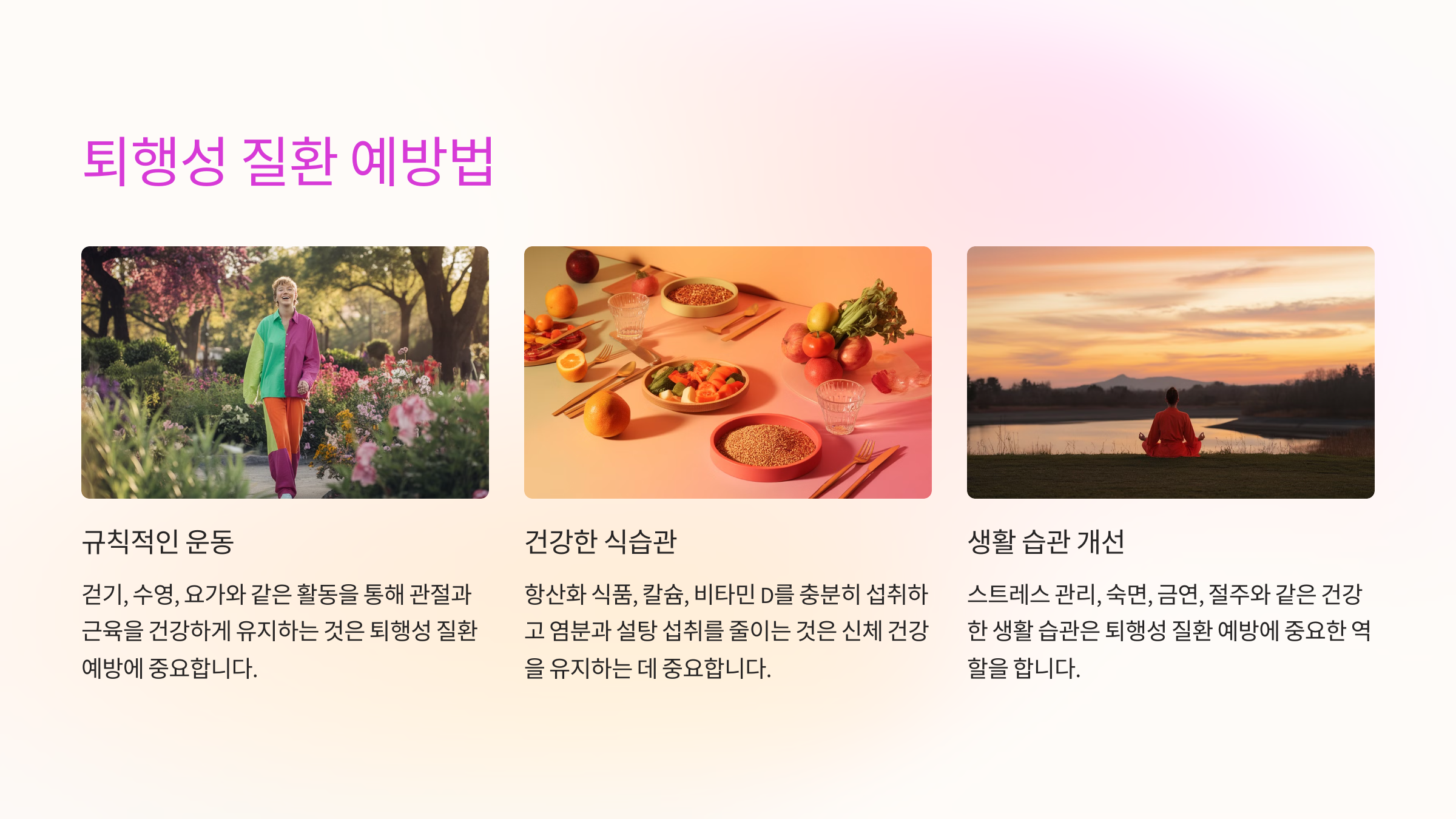 퇴행성 질환은 노화와 함께 자연스러운 과정으로 발생하지만, 예방과 관리를 통해 그 진행 속도를 늦출 수 있습니다.