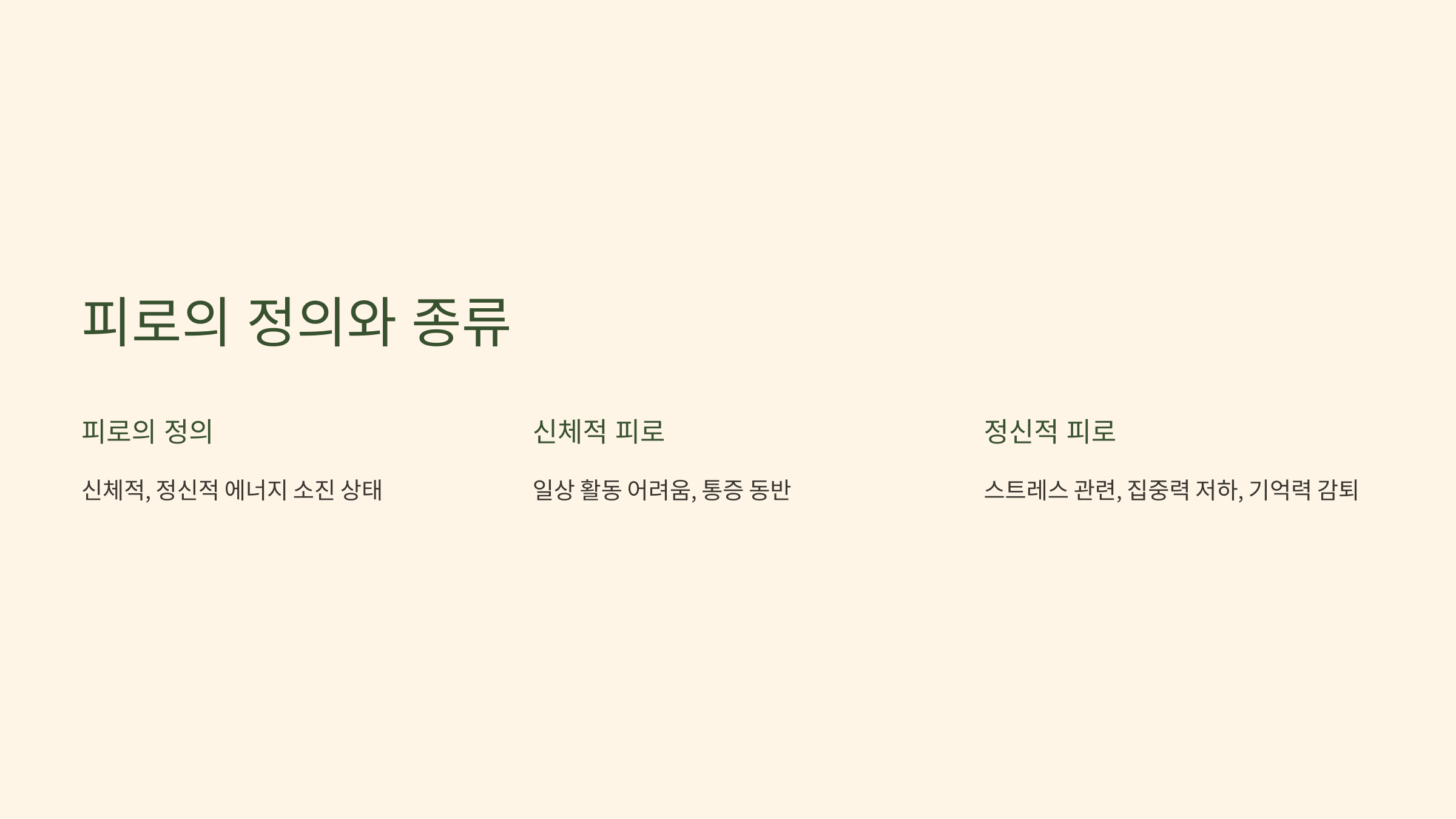 - 정신적 피로: 스트레스와 관련이 많으며, 집중력 저하, 기억력 감퇴 등을 유발할 수 있습니다.