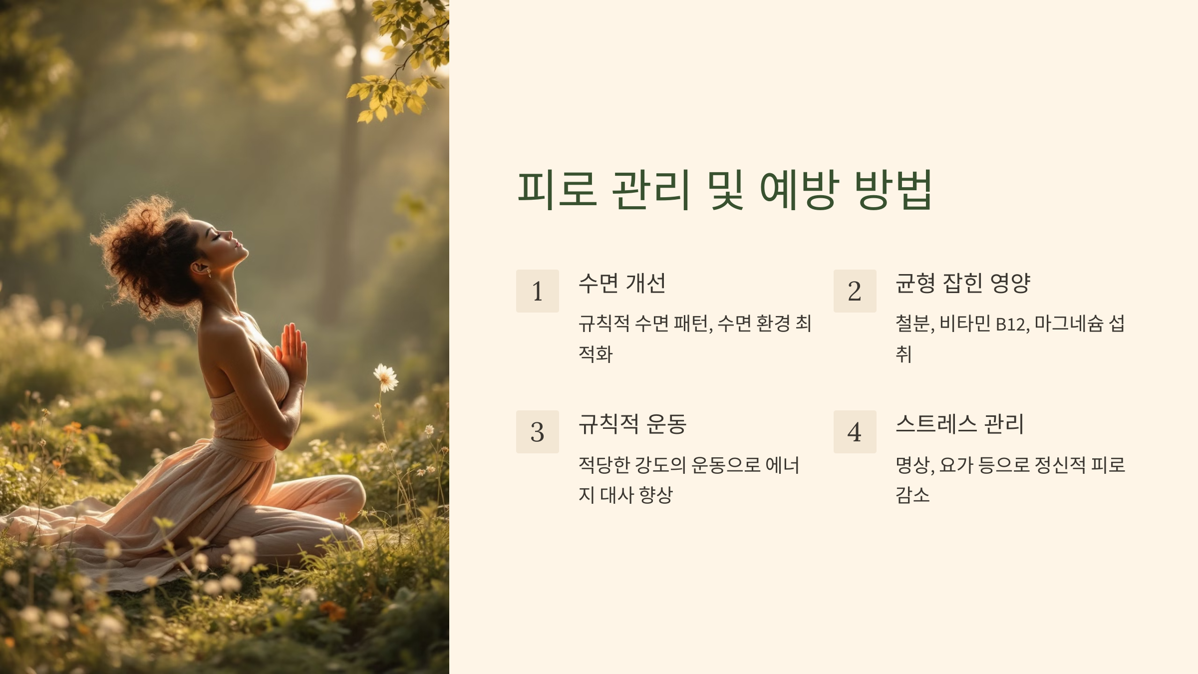 피로를 줄이고 활력을 유지하기 위해 실천할 수 있는 방법들입니다.