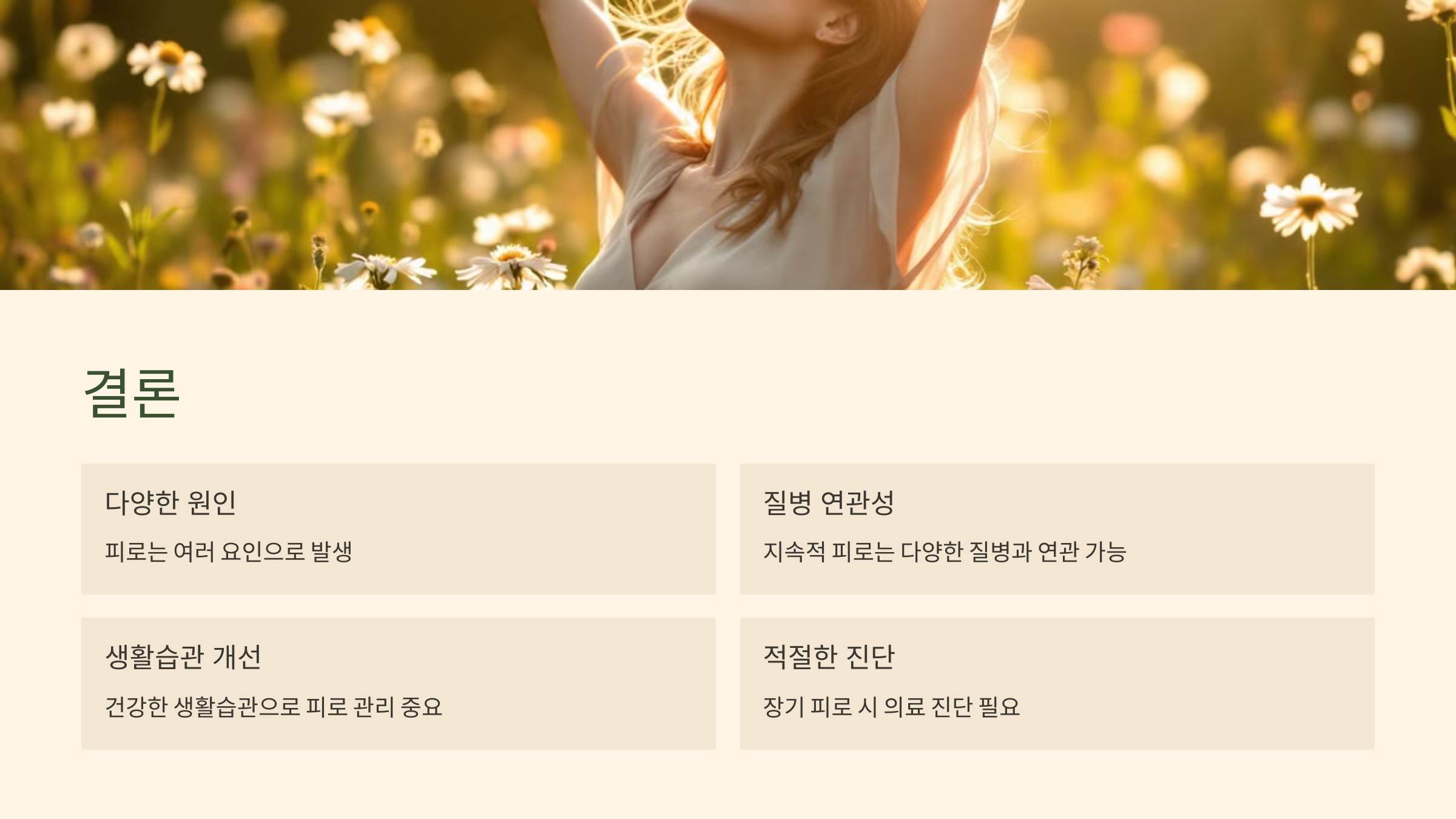 피로는 많은 요인에 의해 발생하며, 지속적인 피로는 다양한 질병과 연관될 수 있습니다. 건강한 생활습관을 통해 피로를 관리하고, 특히 피로가 오래 지속된다면 적절한 진단을 받는 것이 중요합니다. 이번 글이 피로에 대해 이해하고, 자신의 건강을 점검하는 데 도움이 되었기를 바랍니다.