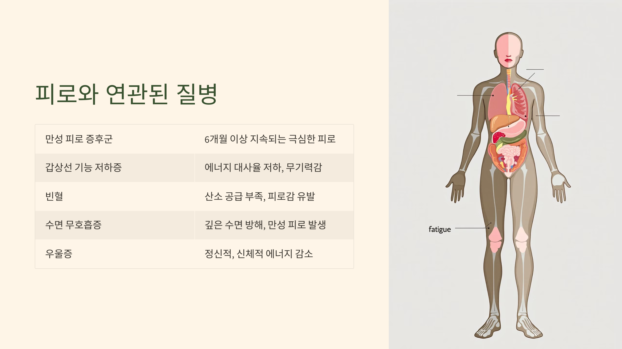 - 빈혈은 혈액이 산소를 충분히 운반하지 못하게 하여 피로감을 유발합니다. 특히 철분 결핍성 빈혈이 피로의 흔한 원인입니다.